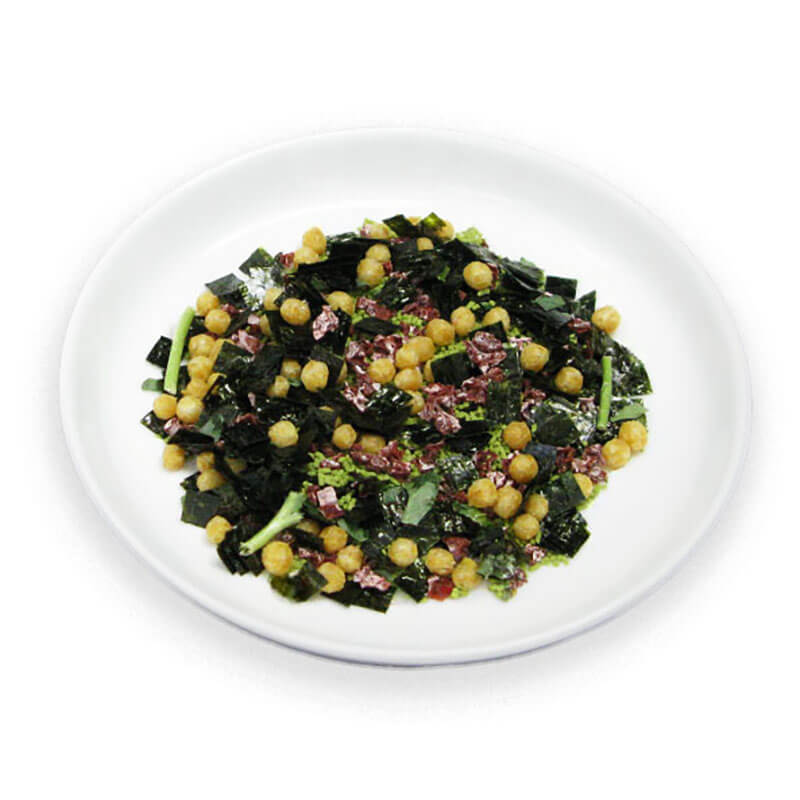 | 原材料表記 | 調味顆粒(食塩、乳糖、抹茶)(国内製造)、梅干加工品(梅干ペースト、デキストリン、α化でん粉)、あられ、海苔、乾燥みつば / 調味料(アミノ酸等)、酸味料、紅麹色素、(一部に乳成分を含む) |