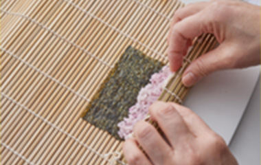 | ①花びらになる細巻きを作る。巻き簾の上にアの焼海苔を光沢のある方を下にして置く。 上3cmあけてすし飯を平らに広げる。 |