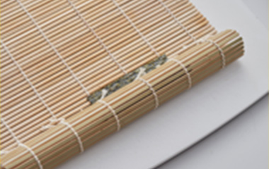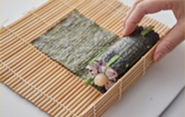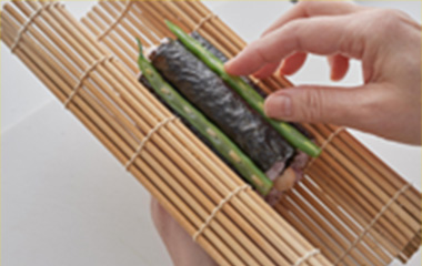 ④巻き簾を手のひらにのせ、②で作った細巻きの3本を巻き終わりを内側にしてのせる。 |