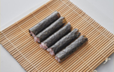 | ⑨⑧の形が綺麗に整ったら、ウの焼海苔を巻き簾で巻いていく。 | ⑩5分ほど置いて海苔を落ち着かせてから、4等分または5等分にカットする。 | ||