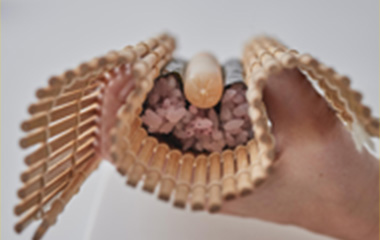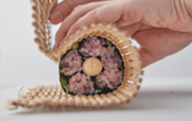 | ④巻き簾を手のひらにのせ、②で作った細巻きの3本を巻き終わりを内側にしてのせる。 | ⑤中央に花の芯になるようチーズかまぼこをのせる。 | ⑥残り2本を隙間なくのせ、花の形になっているか横から覗いて確認しながら丸く整える。 | |