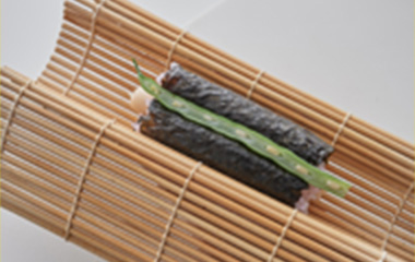 | ⑦一度巻き簾で丸くなるように巻いてから、細巻きの間にインゲンを1本ずつのせていく。 | ⑧イの焼海苔を⑦の中央に巻いていく。インゲンが外れないように巻く。 | ||