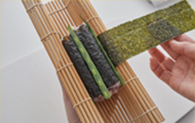 ⑧イの焼海苔を⑦の中央に巻いていく。インゲンが外れないように巻く。 |