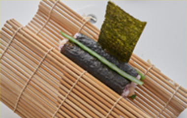 ⑨⑧の形が綺麗に整ったら、ウの焼海苔を巻き簾で巻いていく。 |