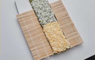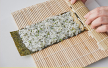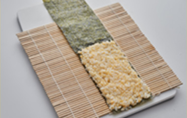 | ①巻き簾の上にアの焼海苔を光沢のある方を下にして縦に置く。下半分に A(卵すし飯)を平らに広げる。 |