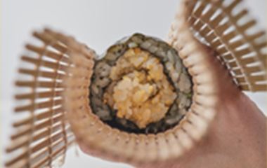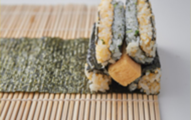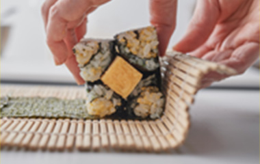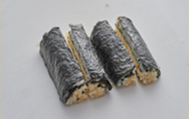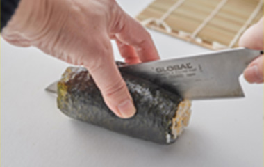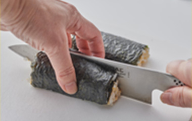 | ⑨形を整え、5分程置いて海苔を落ち着かせてから、4等分または5等分にカットする。 | |||