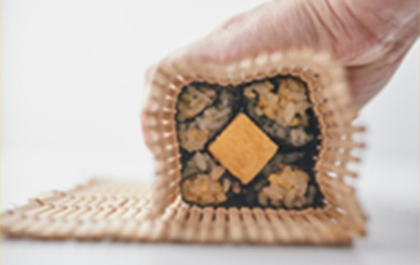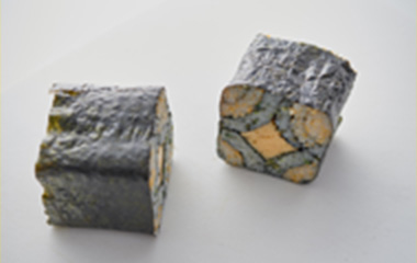 | ⑥海苔の端に④で4等分した海苔巻き2本を背中合わせに置く。 | ⑦その上に卵焼きをくぼみに合わせてのせ、更に残り2本の海苔巻きを背中合わせにのせる。 | ⑧巻き簾で四角になるように巻く。 | |